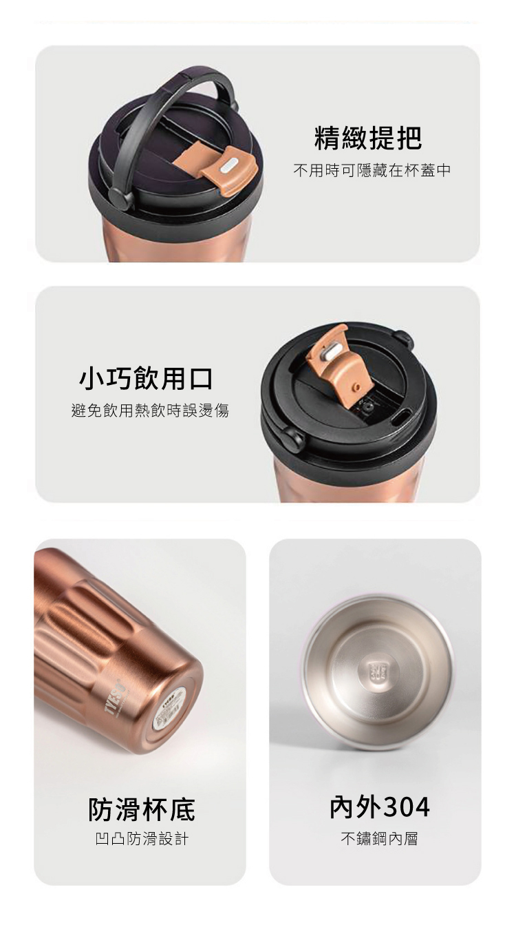 採用大直徑廣口設計,不論是飲用一杯香氣宜人的咖啡,或是使用後的清洗過程,易沖泡易清洗的特性免去了更多煩惱。擁有攜帶方便的隱藏把手設計,同時兼具利於手握的凹凸瓶身設計。為生活增添便利性的同時,更提升了自己時尚品味。